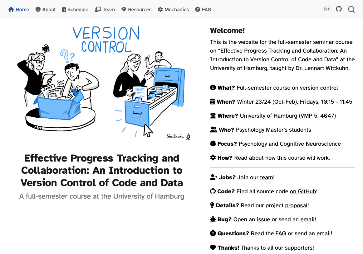 Summary: A hands-on seminar about version control of code and data using Git with curated online materials, interactive discussions, quizzes and exercises, targeted at (aspiring) researchers in Psychology & Neuroscience
