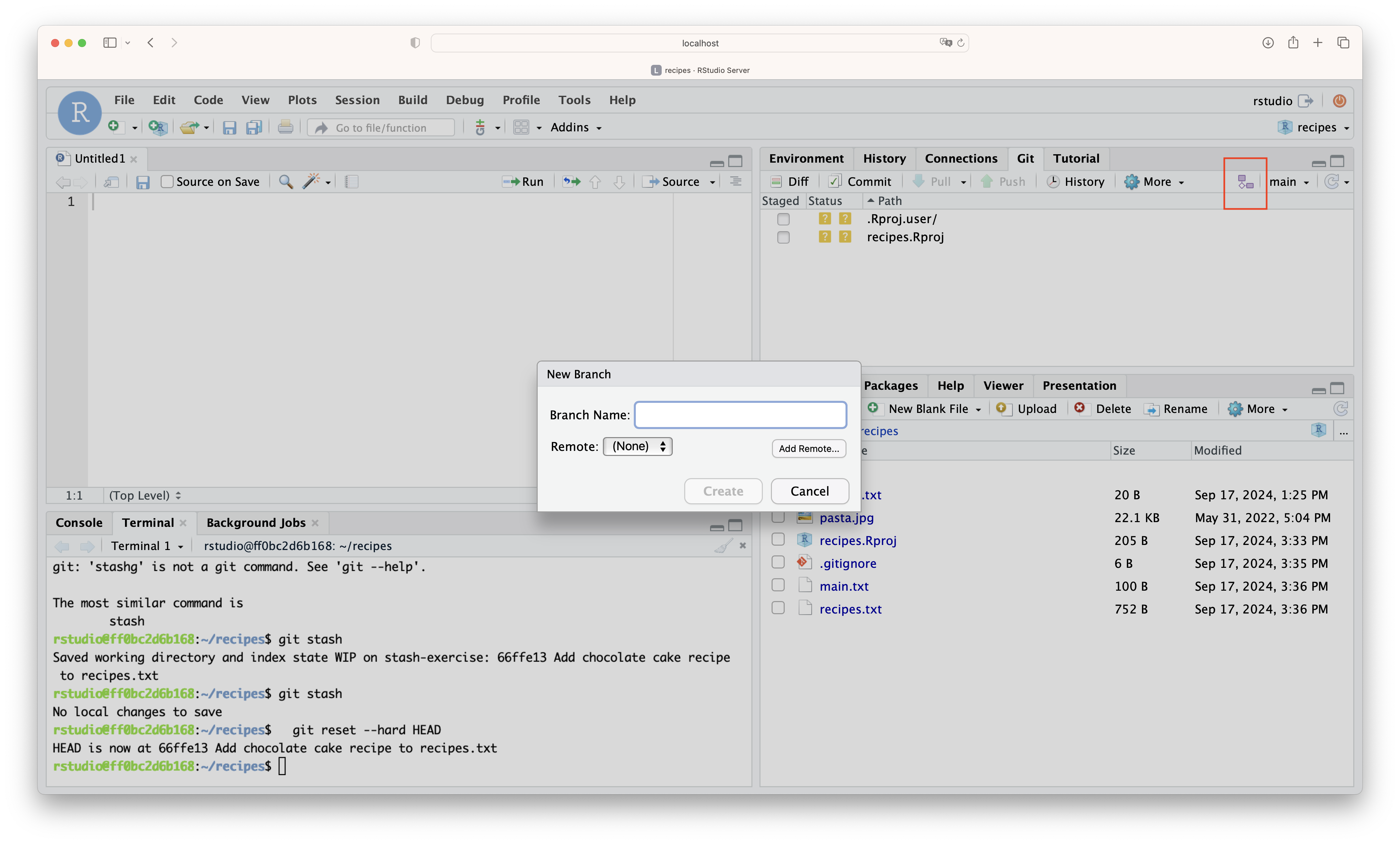 Create and Switch to the New Branch: After naming the new branch, click “Create” to create the branch. RStudio will create the new branch and automatically switch to it. You should see a confirmation message indicating the successful creation and switch to the new branch.