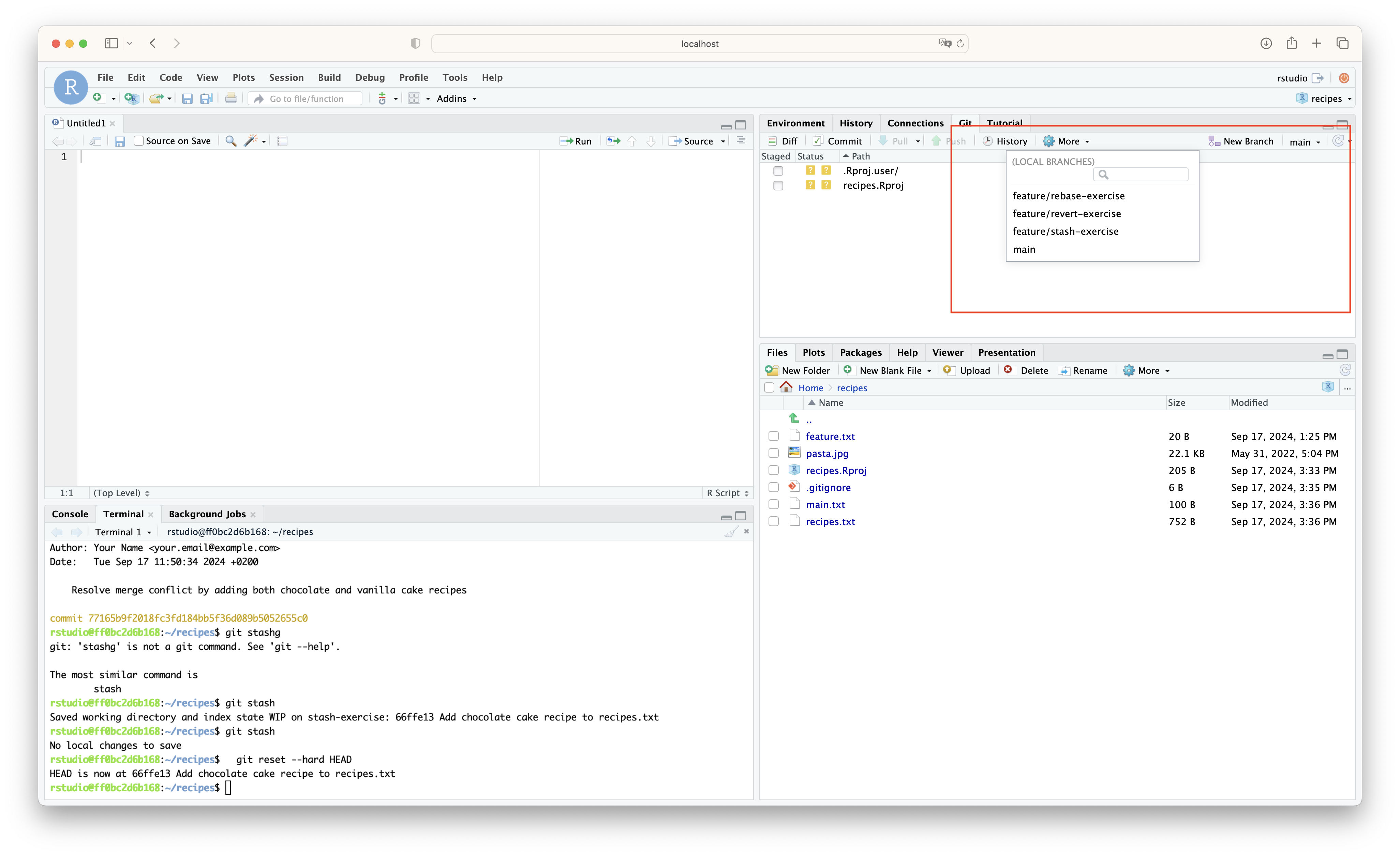 Switch to Another Branch: In the branches dialog, you will see a list of branches. Locate the branch you want to switch to, for example, feature. Click on the branch name (e.g., feature) to select it. After clicking on it, RStudio will switch to the selected branch. You should see a confirmation message indicating the successful switch, similar to the command line output: Switched to branch ‘feature’