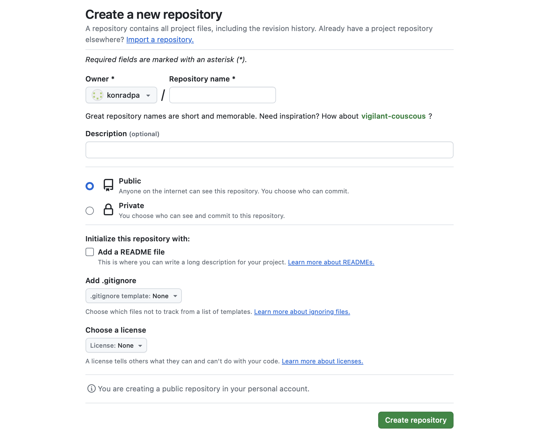 Finally, click the green “Create repository” button at the bottom of the page to create a new repository with these settings.