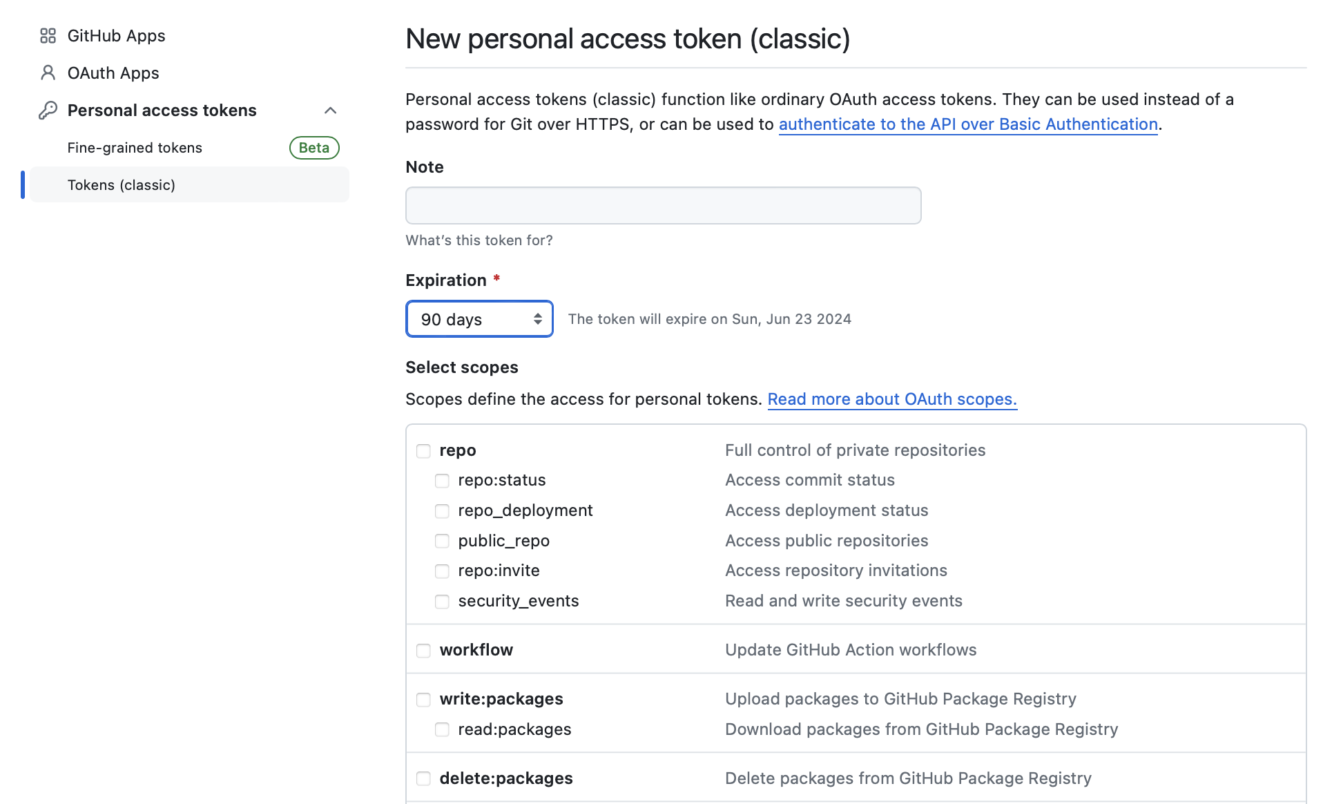 Here are some common scopes you might encounter when creating a GitHub PAT: