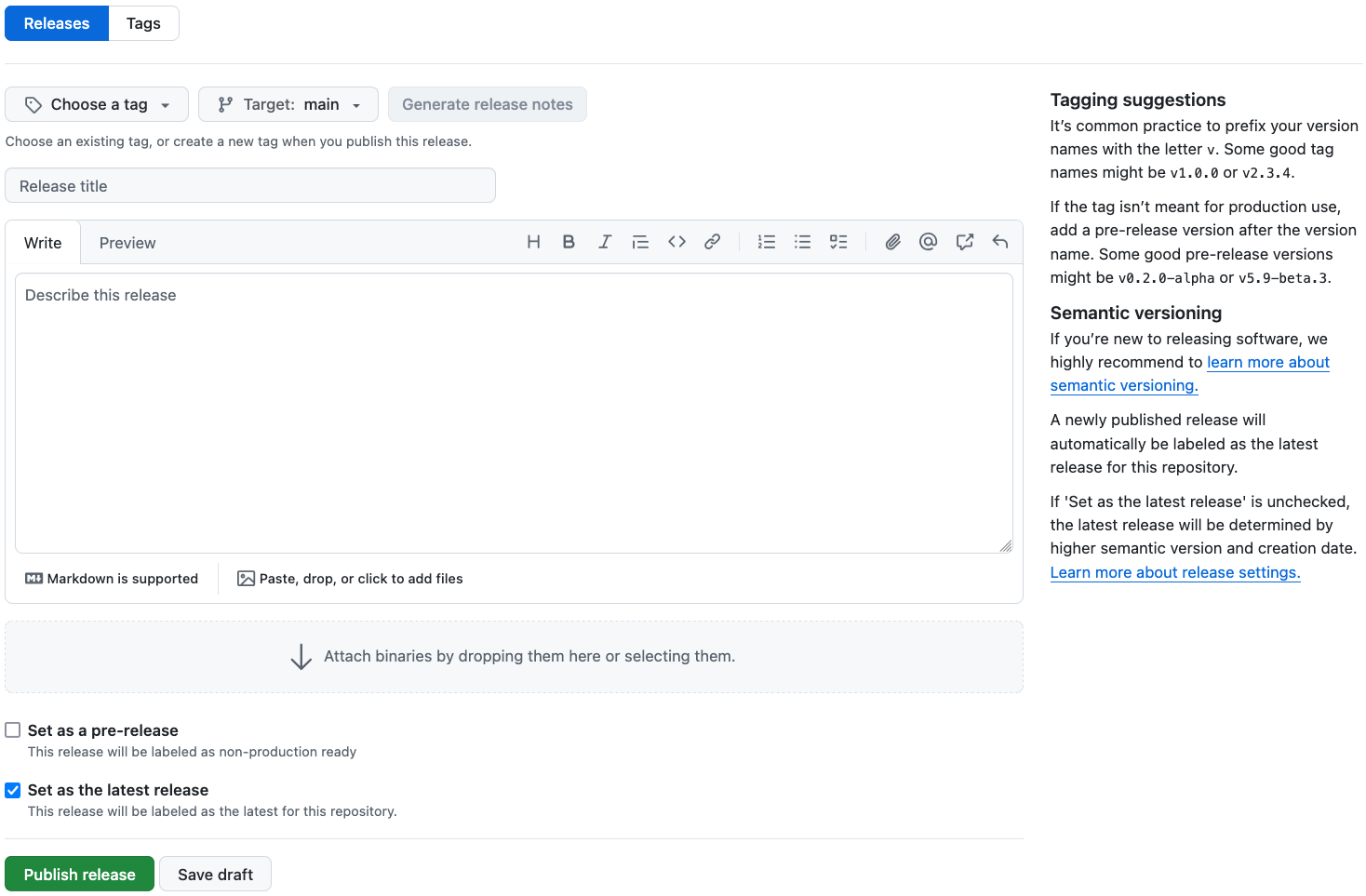 If you’re creating a draft release, you can save it as a draft by clicking on the “Save draft” button. Draft releases are not visible to the public. If you’re ready to make the release public, click on the “Publish release” button.